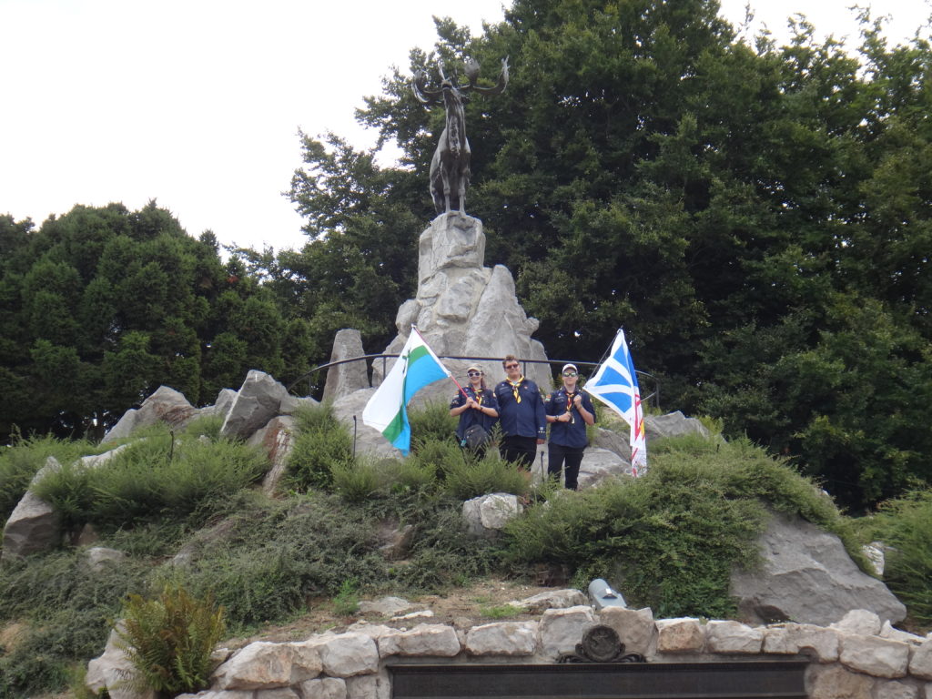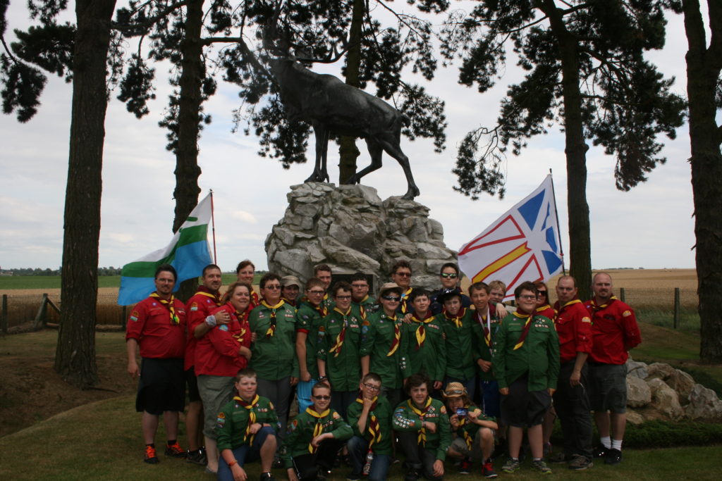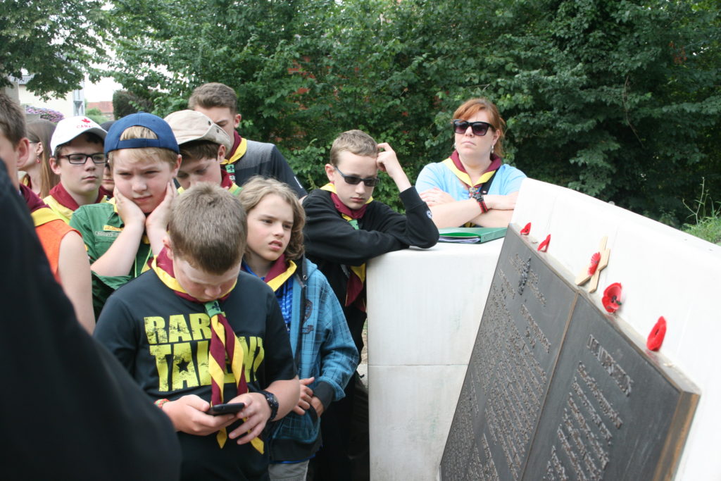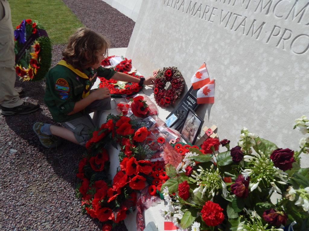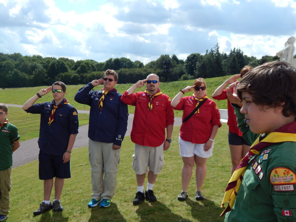 With that done we had one more ceremony to conduct, and one that we knew would be even more difficult.  Our beloved Group Commissioner, Scouter Ed “Baloo” Thorne, had planned to join us on this trip, and we knew he was most looking forward to this moment, standing together at Beaumont-Hamel.  Our youth asked to leave behind a Baloo crest so that he could at least be there with us in spirit.  This became a theme going forward, and thanks to the youth there are Baloo crests at memorials in France, Belgium and the Netherlands.