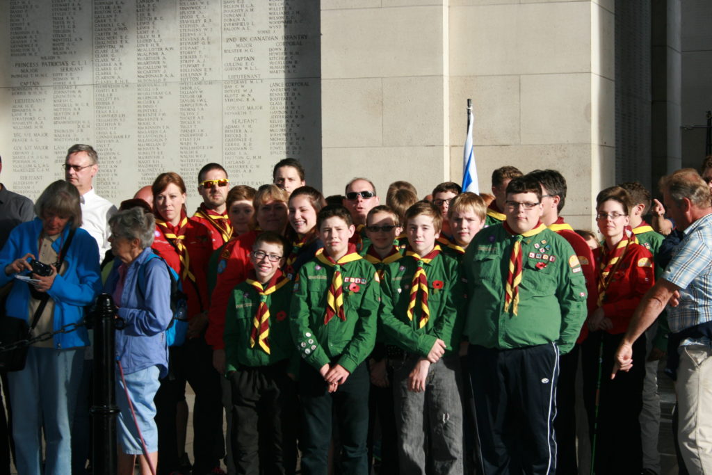 After spending some time exploring the monument, we worked our way to the street and secured what we figured was a decent spot.  Not long after arriving the volunteers at the Menin Gate spotted our Scout uniforms and ushered us into a place of honour behind the buglers… wow!  While we were lining up waiting for the ceremony to begin I was suddenly taken aside by a volunteer in uniform and asked to do a reading at the ceremony!  Obviously I accepted without hesitation.  What a great moment for Scouting 🙂